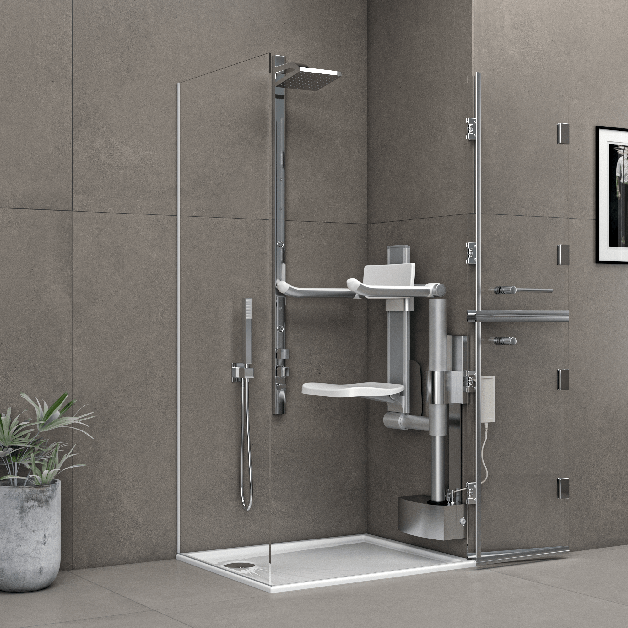 La función de elevación de hasta 25 cm, en el equipamiento de serie, permite salvar cualquier obstáculo a la entrada de la ducha, como platos de ducha elevados, y facilita al Cuidador en las operaciones de higiene diaria. La función de elevación combinada con la función de inclinación facilita la transición de la posición sentada a la de pie.
